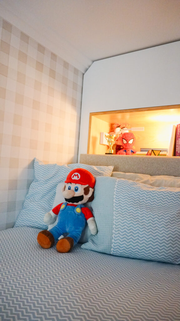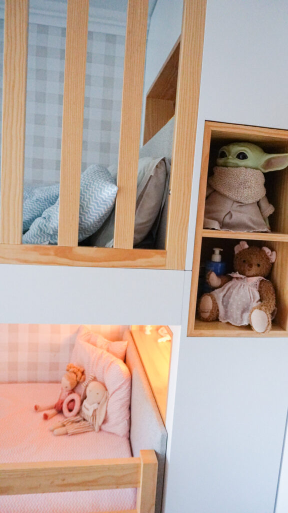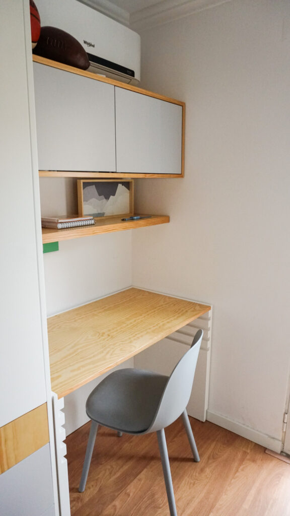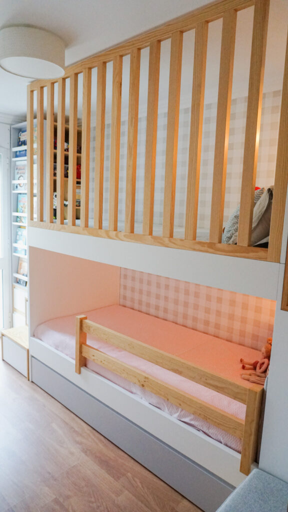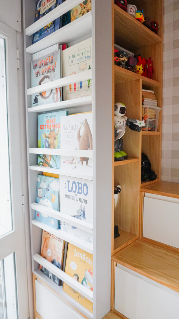 Cada detalhe foi pensado para simplificar o dia a dia. Os degraus com arrumação, a estante de livros acessível e a circulação fluída permitem que o quarto seja vivido com autonomia e conforto. A zona de estudo acompanha o crescimento das crianças, com secretária regulável em altura e arrumação discreta que organiza sem sobrecarregar o ambiente.